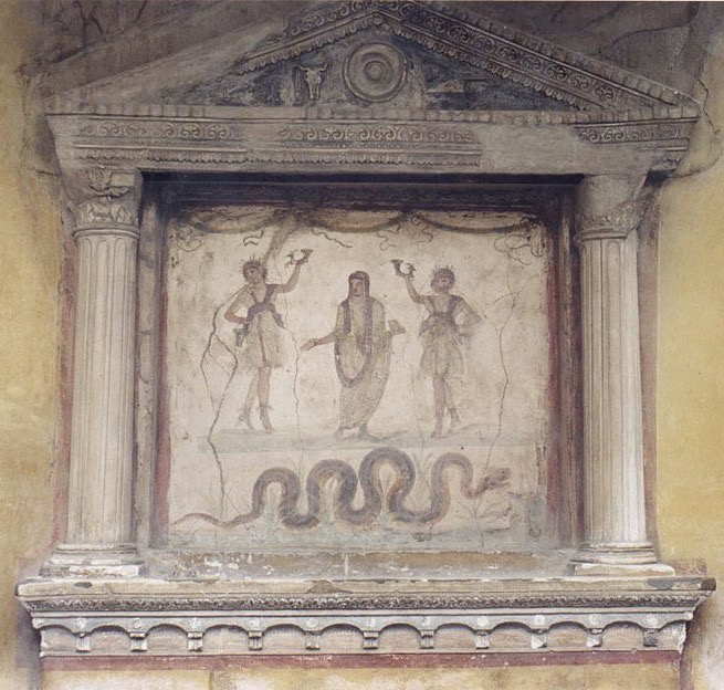 The House of the Veittii in Pompei, in the centre the family tutelary Genius under the guise of the Emperor Nero offering libations to two dancing Lares, with the serpent Agathodaemon, the home good genius
