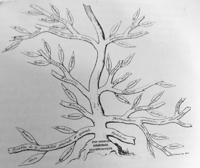 Il illustrait sa pensée par le dessin d’un arbre dont les racines appelées état nerveux héréditaire idiosyncrasique. Du côté droit de l’arbre, les intelligences exceptionnelles occupaient la cime de l’arbre et l’ensemble imbécilité/idiotie les basses branches mais l’ensemble était nourri par la même sève De plus, il avait fait la constatation que certains idiots s’étaient caractérisés, avant de sombrer, par un développement intellectuel précoce et que de nombreux parents d’aliénés s’étaient distingués par leurs bizarreries, leurs facilités intellectuelles, leurs aptitudes pour les arts et il avait fait de cette hérédité une sorte d’aphorisme : Excentricité chez les parents, délire chez les enfants. C’est son fils Paul qui dans son œuvre Les Excentriques va approfondir cette idée